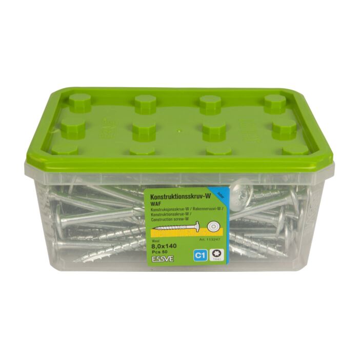 Wkręt do drewna WAF wykonany jest z utwardzanej stali węglowej z powłoką CorrSeal C4 do zastosowań zewnętrznych i wewnętrznych. Łeb ma dużą średnicę, co pozwala uzyskać dużą siłę docisku przy montażu. Łeb posiada bardzo małą wysokość, co jest korzystne przy montażu. Jest on wyposażony w specjalne nacięcie (frez), co pozwala użyć niewielkiego momentu dokręcania w drewnie i zmniejsza ryzyko pękania materiału.
