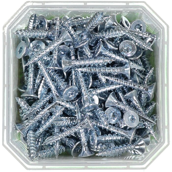 Wkręt jest wyprodukowany ze stali utwardzanej, ocynkowanej elektrolitycznie o klasie antykorozyjności C1. Nacięcie frezujące na gwincie umożliwia zastosowanie niskiego momentu wkręcania w drewnie, i ogranicza pojawianie się pęknięć. Spodnia część łba jest gładka, co oznacza, że wkręt jest idealny do mocowania na przykład zawiasów, bez uszkadzania powierzchni materiału. Wyposażony w gniazdo montażowe TX.