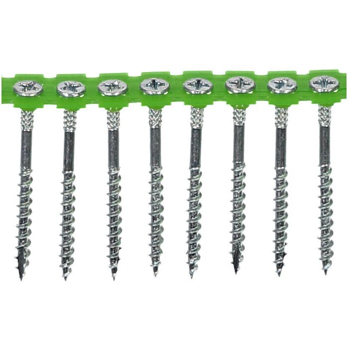 Wkręt wyprodukowany ze stali utwardzanej ocynkowanej elektrolitycznie. Posiada gniazdo montażowe Philips Ph2. Łeb wkrętu wyposażony w cztery frezy, ułatwiające zagłębienie w twardym podłożu drewnianym. Wkręt na taśmie pasuje do najczęściej spotykanych na rynku wkrętarek do seryjnego osadzania wkrętów.