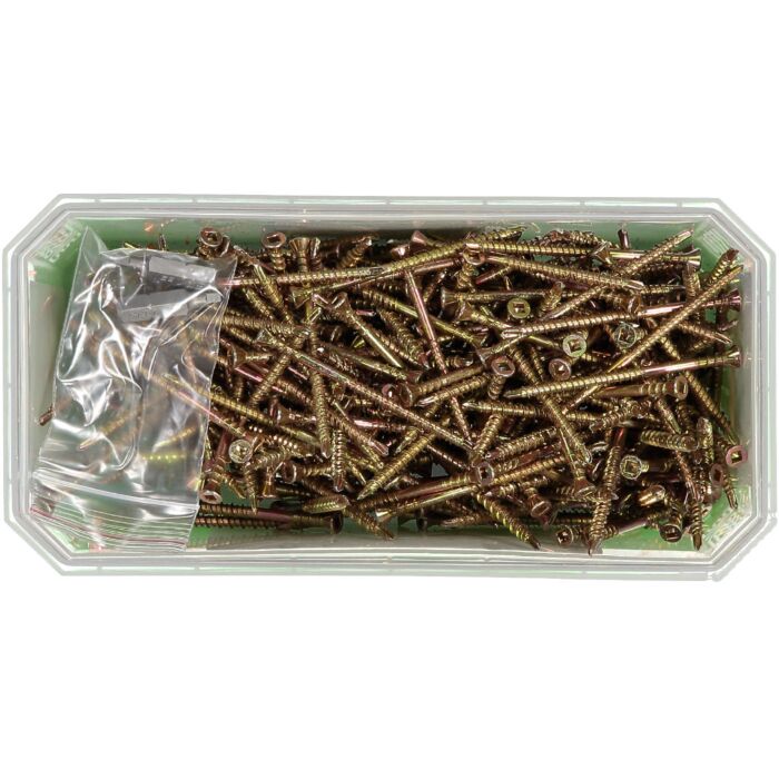 Wkręt wykonany z hartowanej stali węglowej zabezpieczonej antykorozyjnie żółtym chromem. Gwint zasadniczy z nacięciem i zredukowaną nawiertką, które mają za zadanie wyeliminować pęknięcia i rozwarstwienia mocowanych elementów drewnianych oraz zredukować do minimum moment obrotowy wkrętarki. Dodatkowy gwint pod łbem pełni rolę elementu dociskającego montowaną deskę do podłoża. Zredukowany do minimum łeb stożkowy z gniazdem R1, po prawidłowym montażu jest praktycznie niewidoczny.