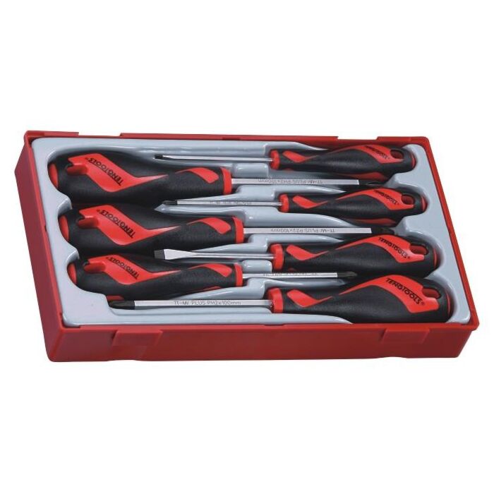 Zestaw składający się z 7 wkrętaków płaskich oraz krzyżowych typu Phillips i Pozidriv. Z trzonem ze stali TT-MV-PLUS. Ergonomiczna, dwukomponentowa rękojeść z otworem do zawieszania. Dostarczany w pojemniku z tworzywa sztucznego z odłączaną pokrywą. Pasuje do skrzynek i wózków narzędziowych Teng Tools.